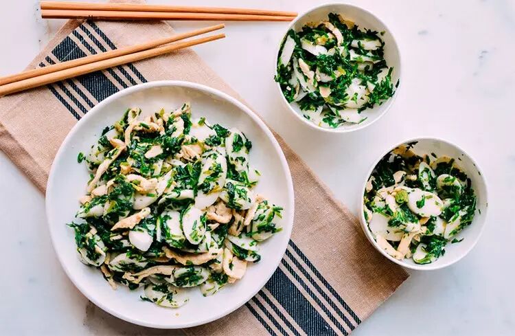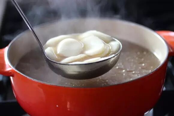 炒年糕不容易做好,汤年糕最便当。过年嘛,家里总有大锅鸡汤备用,鸡汤烧一开,丢入冬笋片煮透,再下黄芽菜和年糕,五分钟便是一顿好饭。没有鸡汤,就用咸菜肉丝放汤煮年糕,加一勺猪油,也很鲜香美味。再不济,随便什么残汤剩菜,因着年糕细滑软糯口感和甘甜的稻米香,煨一煨总也很可口。